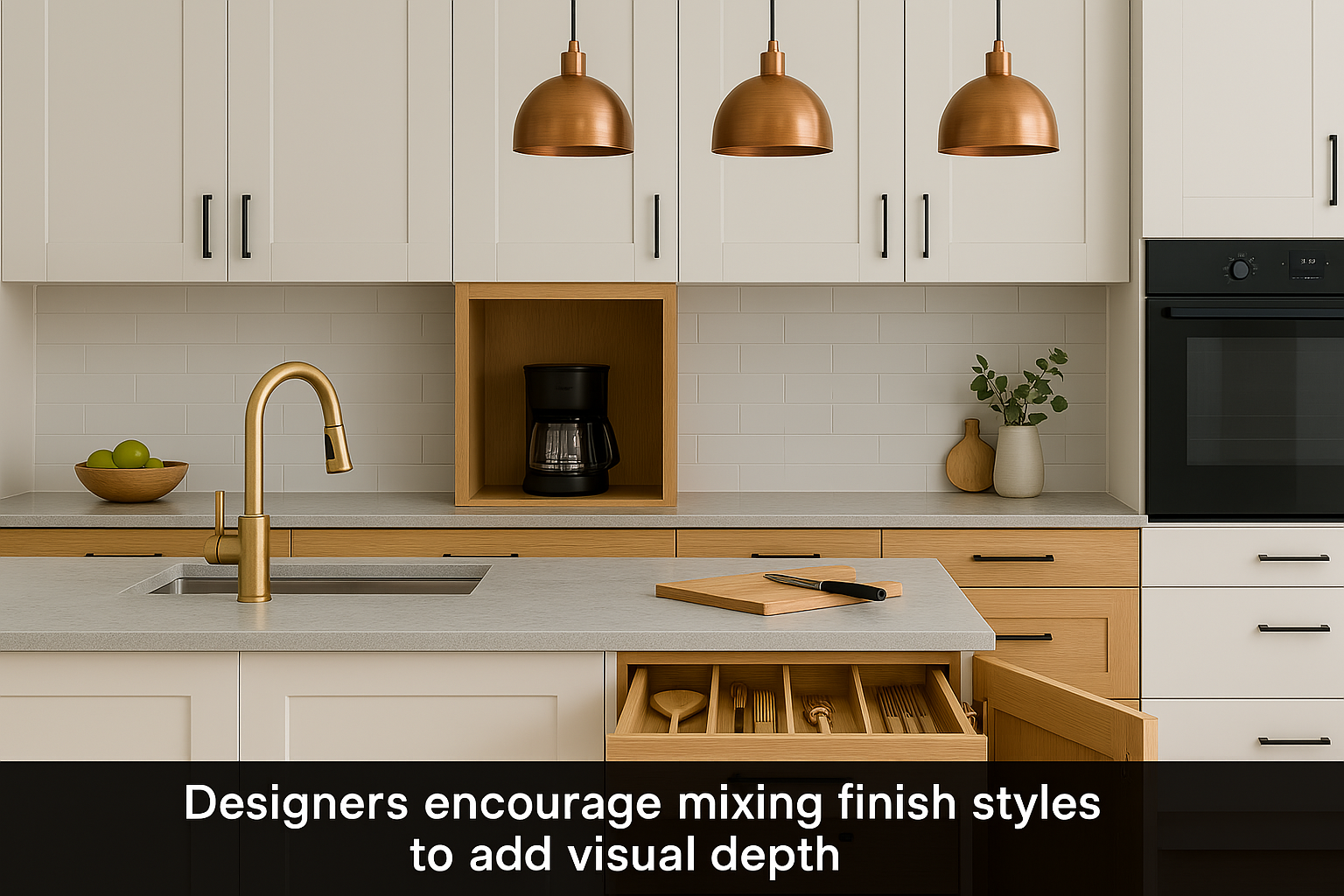 Minimalism in shape but not in detail—that’s the 2025 aesthetic. Instead of matching every knob and fixture, designers encourage mixing finish styles to add visual depth. Think brushed gold faucets paired with matte black handles, or copper light fixtures with nickel accents. Amaraly’s team coordinates plumbing, cabinetry, and lighting work so that these mixed-metal touches feel intentional and cohesive.